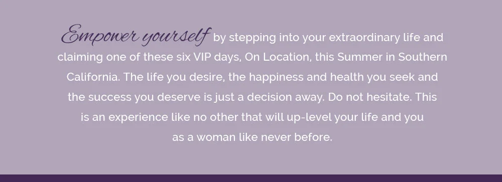 To add to the luxurious and comprehensive elements of the coaching expertise you'll receive, you'll also benefit from the profound energy of each location. Each feminine, high-frequency location is designed to raise your vibration so that you naturally attract the desires of your heart.